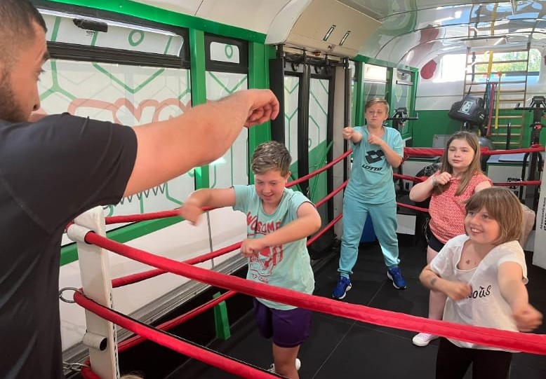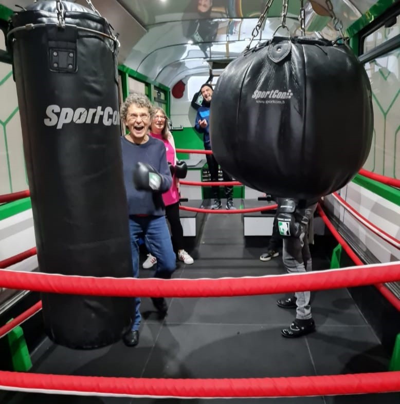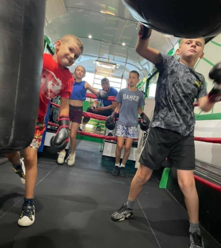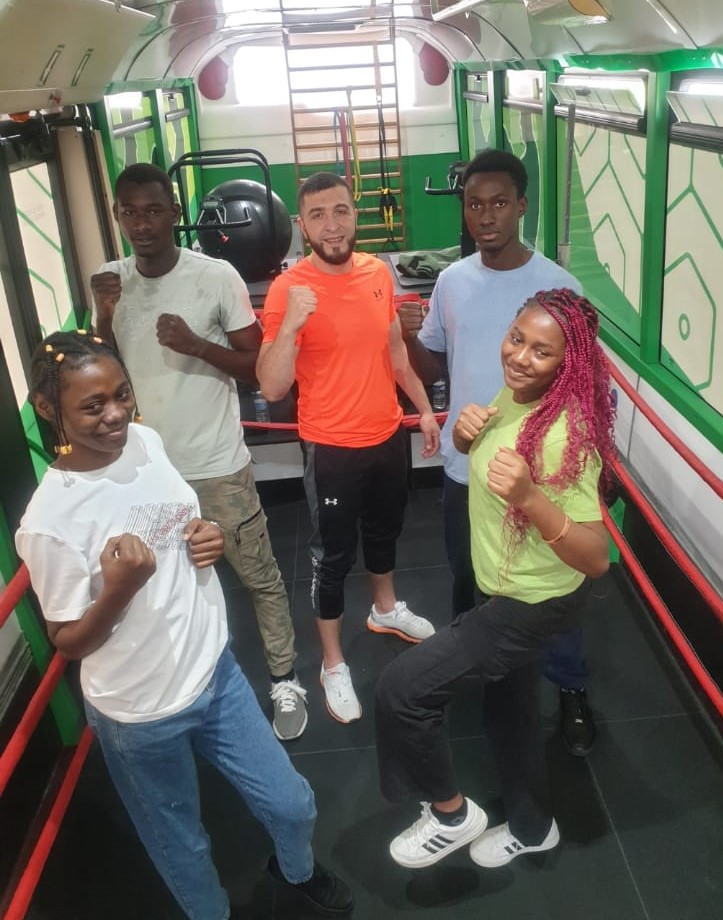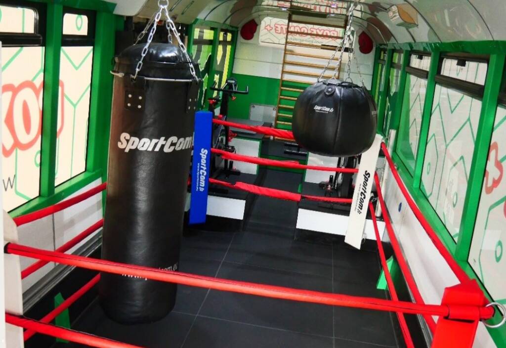 Le bus est aménagé en véritable salle de sport mobile avec ring, sacs de frappe, vélos et tout le matériel nécessaire pour un entraînement complet et varié.