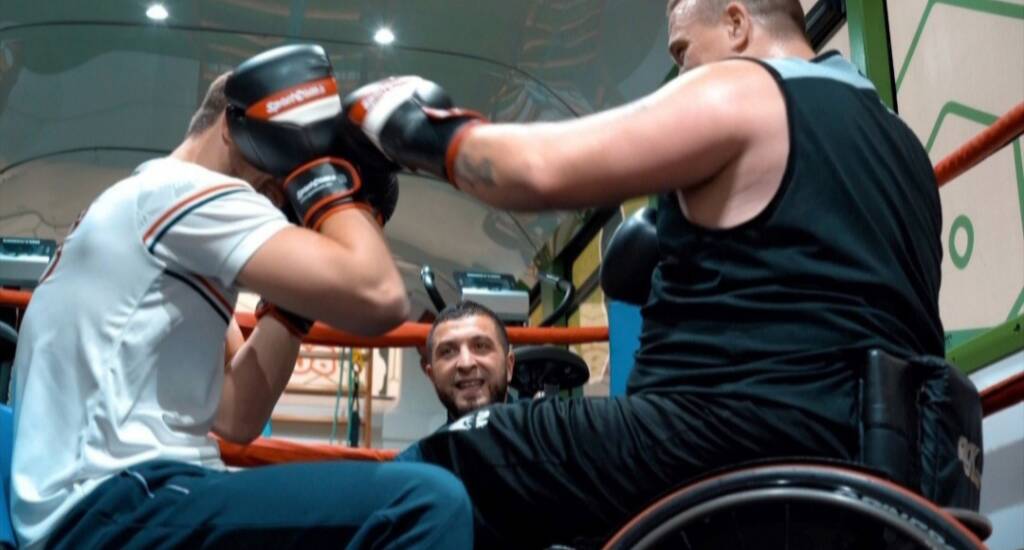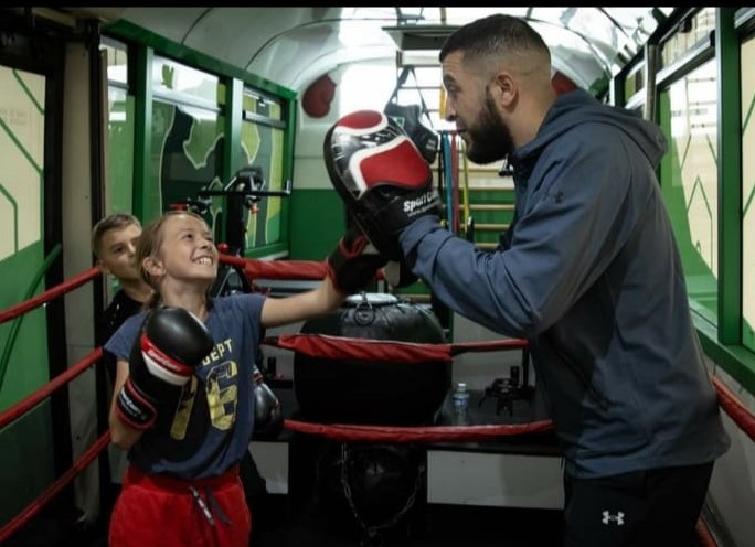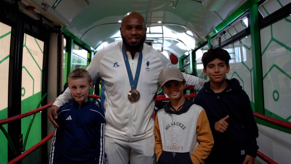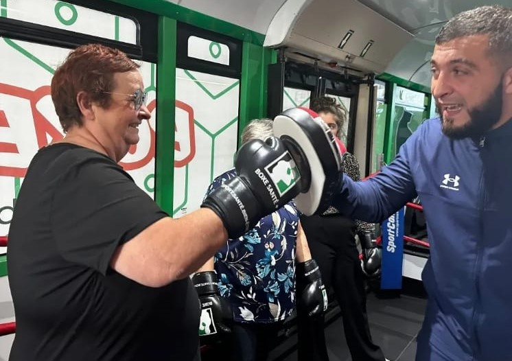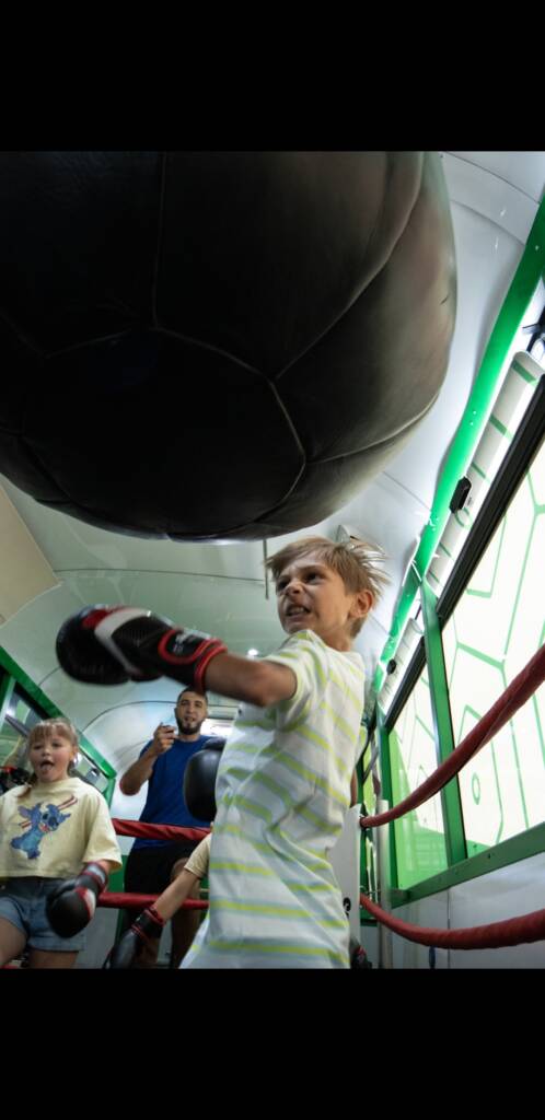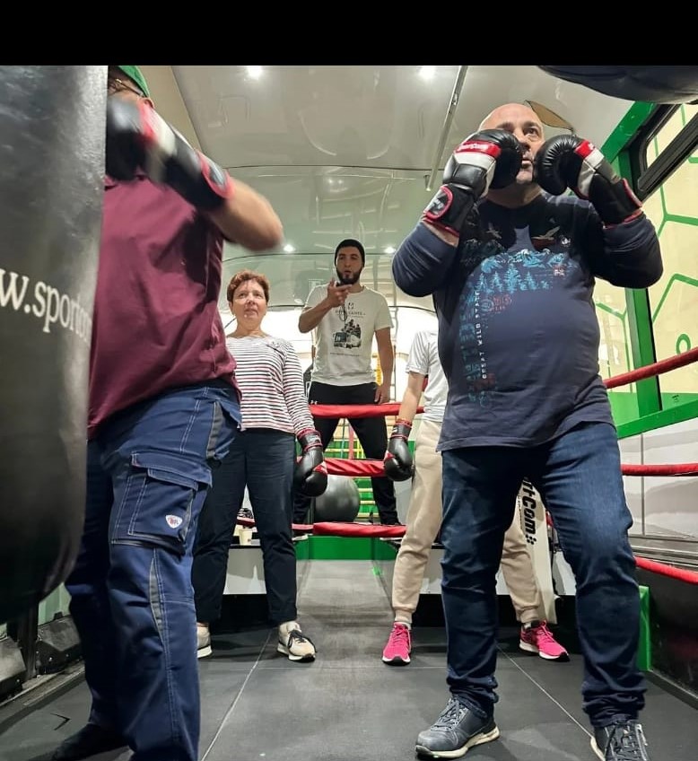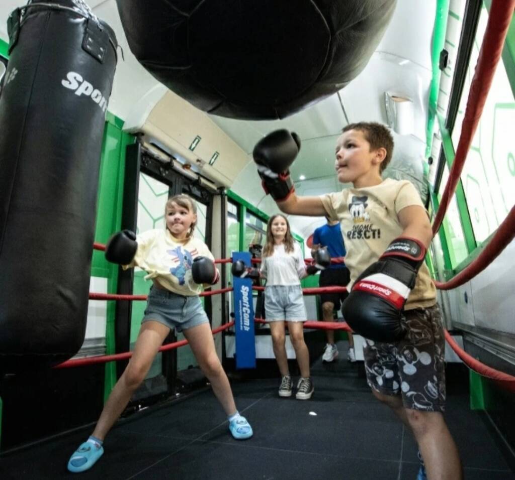 Le bus est aménagé en véritable salle de sport mobile avec ring, sacs de frappe, vélos et tout le matériel nécessaire pour un entraînement complet et varié.