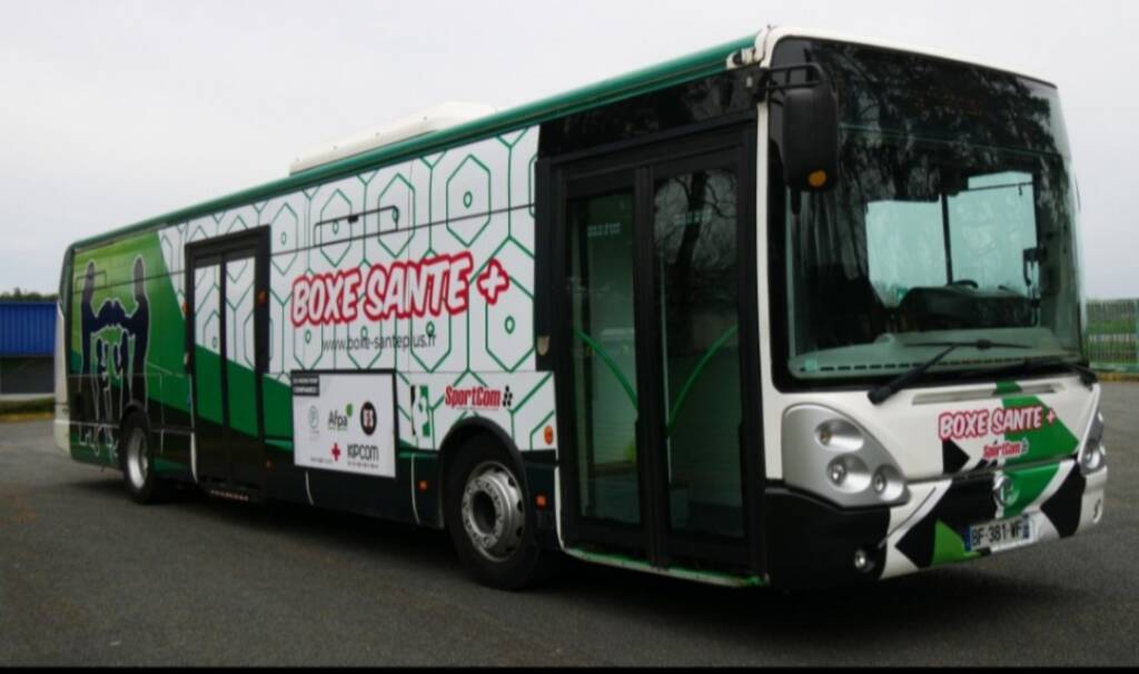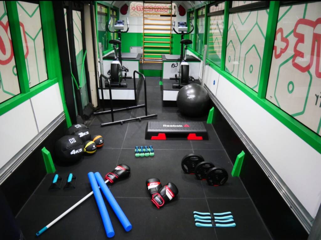 Un bus unique, transformé en salle de sport itinérante.